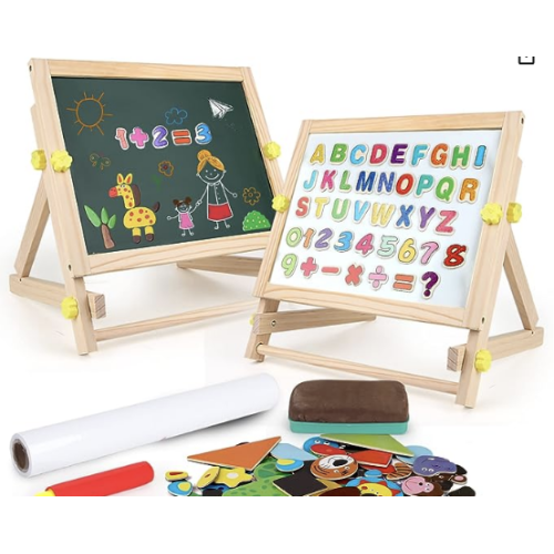 Multi-Purpose Tabletop Easel: Includes dry-erase board and chalkboard, built-in wooden paper roll holder, paper roll, magnetic shape blocks, and over 140 letter and number magnets. Product size: 39*37*30cm. STURDY AND DURABLE: Made from high quality wood that folds flat for easy storage. Double-sided board: DOUBLE-SIDED BOARD: One side is a magnetic dry erase board and the other is a chalkboard. Ideal for learning and being creative at home and at school. Educational Gift: Create many designs with magnetic wooden shape blocks, learn the alphabet and spelling of words with the magnetic letters, numbers. Great gifts.