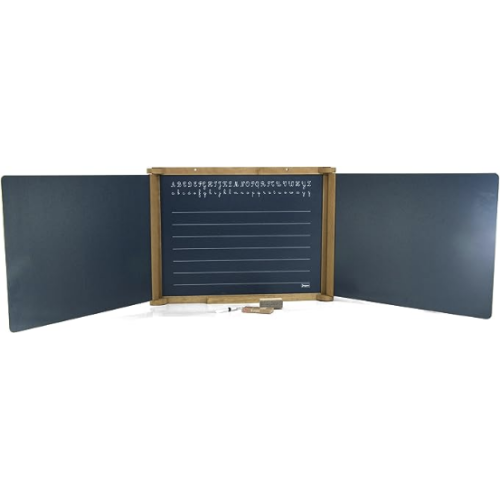 Like at school: Tryptic Board in oak-stained wood A central slate and two flaps for dry-erase marker and chalk Dimensions of the open product: 156 x 43 cm, dimensions of the closed product: 56 x 43 cm Minimum age: 3 years Manufacture French Works without battery